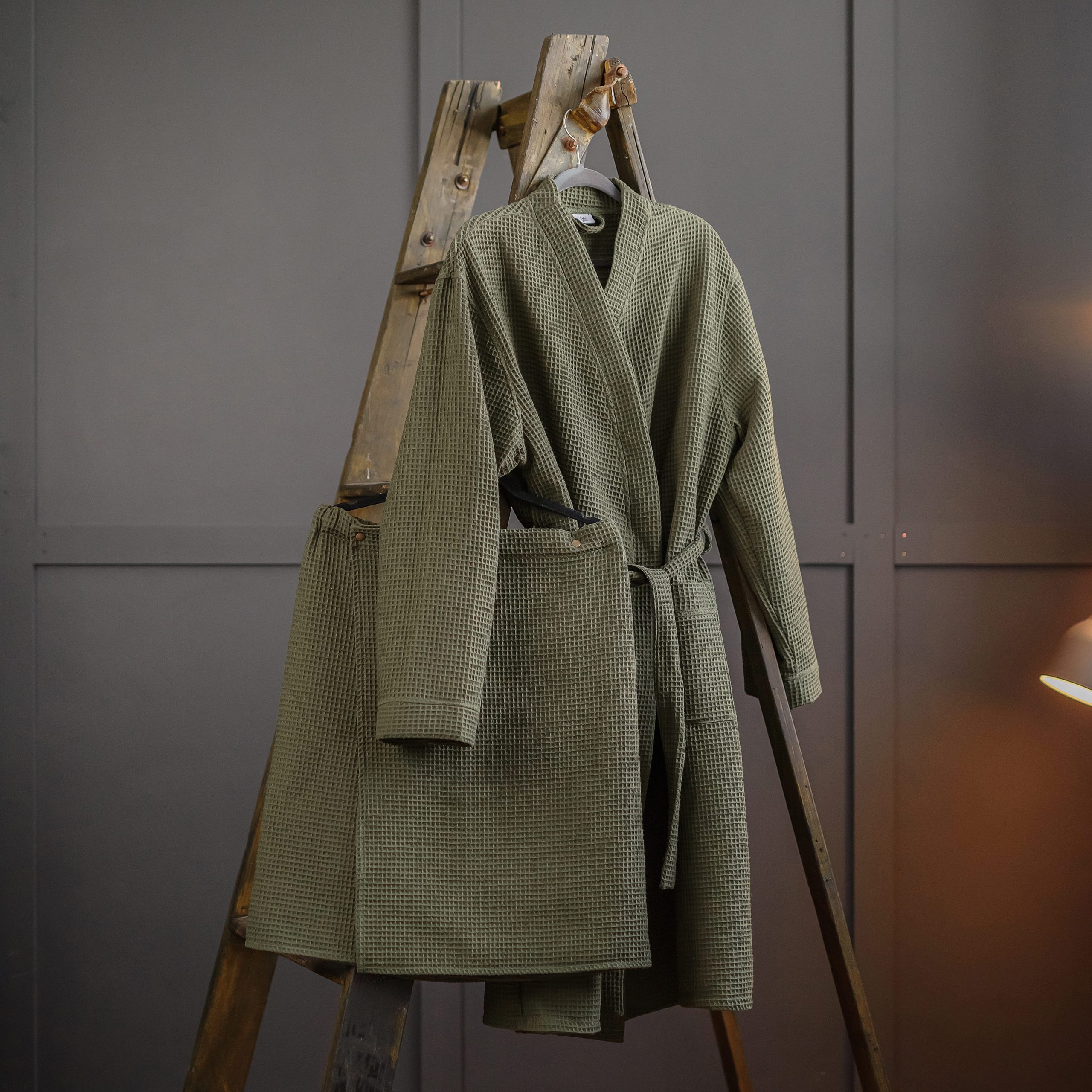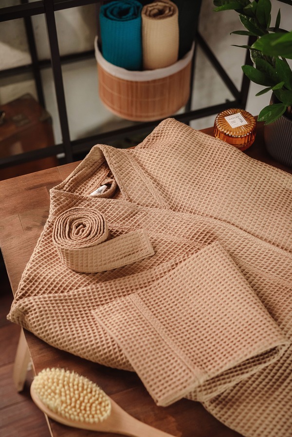 Банный халат и килт(полотенце) изготовлены из мягкого хлопка вафельной вязки, невероятно приятного к коже. Идеально подходит для выходных, посещения сауны или отдыха после ванны. Он имеет два глубоких накладных кармана и петлю для подвешивания на шее.